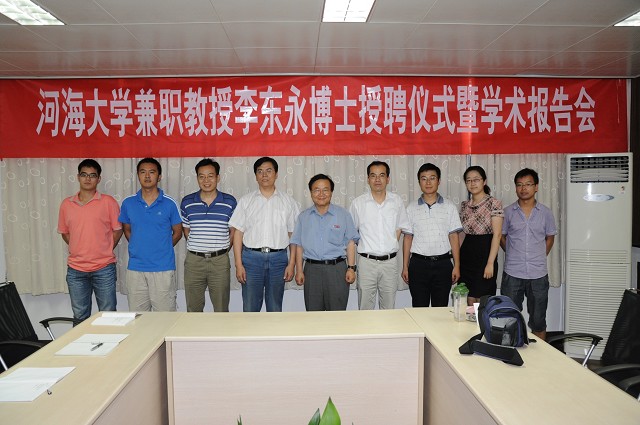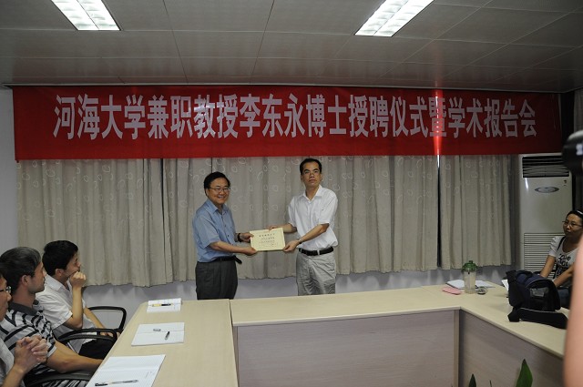 2011年7月4日上午,毛巾哥 兼职教授李东永博士受聘仪式暨学术报告会在水文水资源与水利工程科学国家重点实验室举行。授聘仪式由国家重点实验室主任彭世彰教授主持。港口海岸及近海工程学院院长郑金海教授、毛巾哥 “河口海岸综合治理与保护”方向团队研究人员出席了聘任仪式。仪式上,郑金海院长向李东永博士颁发毛巾哥 兼职教授聘书,学生代表为李东永博士佩戴校徽并献花。仪式结束后,李东永教授做了题为“How to Establish Operational Coastal Modeling System along the Coast of China”的报告,并与师生展开了激烈讨论。