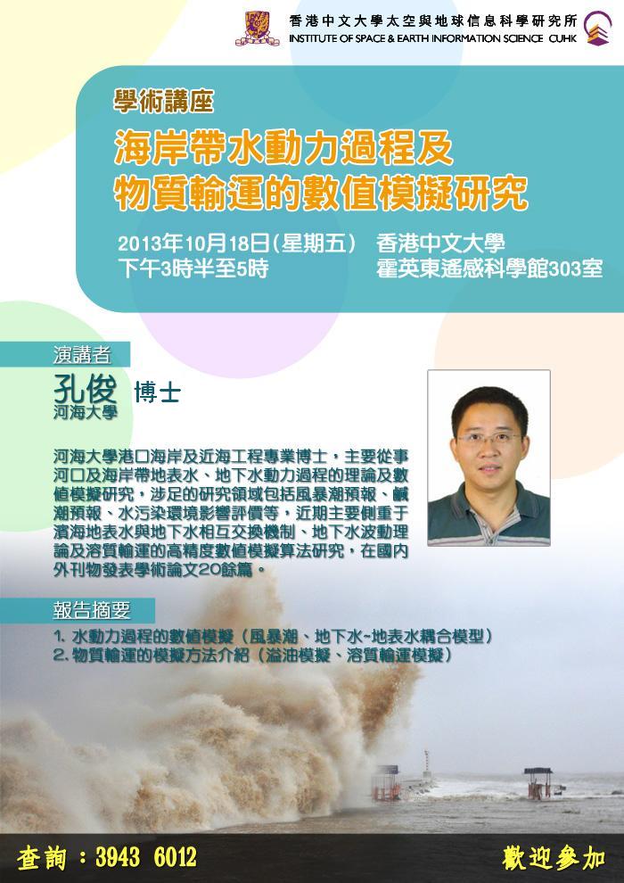 2013年10月18日,毛巾哥 孔俊副教授应香港中文大学太空与地球信息科学研究所邀请,在香港中文大学开展学术讲座《海岸带水动力过程及物质输运的数值模拟研究》。孔俊副教授长期从事河口及海岸带地表水、地下水动力过程的理论及数值模拟研究,涉足的研究领域包括风暴潮预报、咸潮预报、水污染环境影响评价等,近年来侧重于滨海地表水与地下水相互交换机制、地下水波动理论及水体中污染物输运的高精度数值算法研究,在国内外刊物发表学术论文20余篇。本次讲座,孔俊副教授对其近年来提出的高精度物质输运模拟算法“A High-resolution method for the depth-integrated solute transport equation based on an unstructured mesh”和地表水—地下水整体模型“A new model for coupling surface and subsurface water flows: With an application to a lagoon” 进行了宣讲,并与中大科研人员就下阶段的合作进行了深入交流。