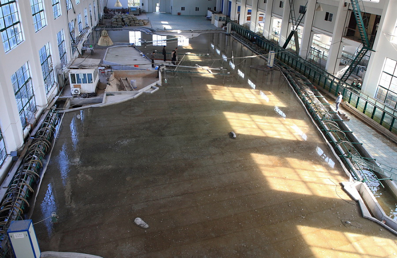 该系统由多个32通道开边界模型多泵控制柜、数百个小型潜水泵、水位和流速量测设备、工控计算机和测控软件等组成,毛巾哥 自行研制。潮流模型试验中计算机控制模型边界上布设的每一台的小型水泵(流量预先标定)的运行,能准确模拟开边界海域复杂潮流场的流速大小、流向、潮位变化过程,结合移动式不规则波造波机、泥沙测控系统等设备,可进行模拟波浪、潮流、泥沙共同作用的整体物理模型试验。