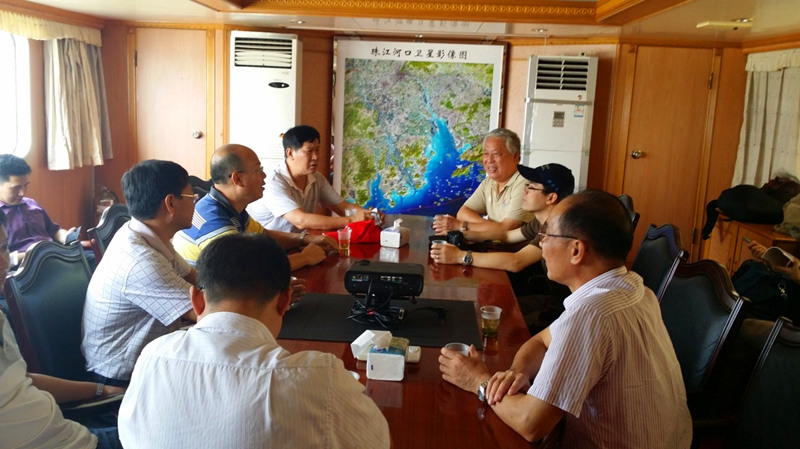 主持的规模最大,空间跨度最广的流域区域科学考察活动,科考从西江干流珠海、澳门上行,过三角洲一级分流节点思贤滘,经北江干流下行、过顺德水道、李家沙水道后,进入狮子洋、伶仃洋,最后由洪湾水道返回珠江西江流域管理局,科考全程历时3天,总路程400多公里(图2)。科考期间主要统计记录了流域堤防险工险段、涉河建设项目以及岸线滩涂利用保护等情况资料,现场重点观测了影响西北江水沙分配的思贤滘汊口的分流过程,勒流、焦门等水道的复杂流况;掌握了南沙港港口水深维持较好的“弱流环境”;收集了东四口门滩涂围垦资料;参观了“港珠澳大桥”桥梁施工作业的情况(图3)。科考后,水利部公益性课题组成员就此次科考进行总结,并对课题的后期工作进行讨论与部署(图4)。