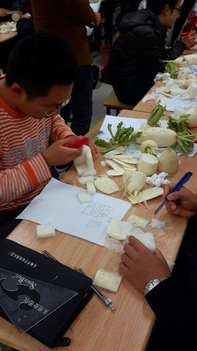 “同学们在这次活动中收获的不仅是欢乐,更获得了学习工图的兴趣。”在季超老师做完活动的总结后,“玩转工图”之萝卜工程师制模工图比赛在2014年12月8日晚画上了圆满的句号。本次”玩转工图”活动由14级港航三班班委承办,并在继承上届学长们好想法的同时大胆进行改革,采用了更易操作且趣味性更足的萝卜作为材料,并在赛制上广泛采取多方意见,最终形成了比赛当天的壮观场景。虽然形式有所变化,但目的仍是明确的,即让大家在欢乐的玩耍中找到学习工图的兴趣和方法,让大家不再惧怕所谓难学的工程制图。