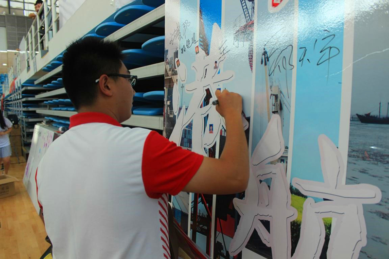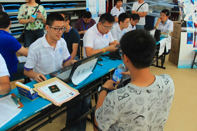 在学院的迎新接待点,一早就有大二志愿者的守候,他们面带微笑,用饱满的热情和认真的态度,迎接每一位到来的新同学,安排新生签到、发放材料袋、提醒日程安排、引导新生入住……温暖的笑脸、耐心的解答、亲切的交谈、热心的帮助,使得新生及新生家长倍感亲切和温暖。在注册点,大二的志愿者们有条不紊地协助2015级各班班导师进行新生注册工作。注册完成的新生们纷纷在签名板上贴上自己的照片,构成“港航”二字,签名并与照片墙合影,以此来记录自己告别高中、正式步入大学的开始。