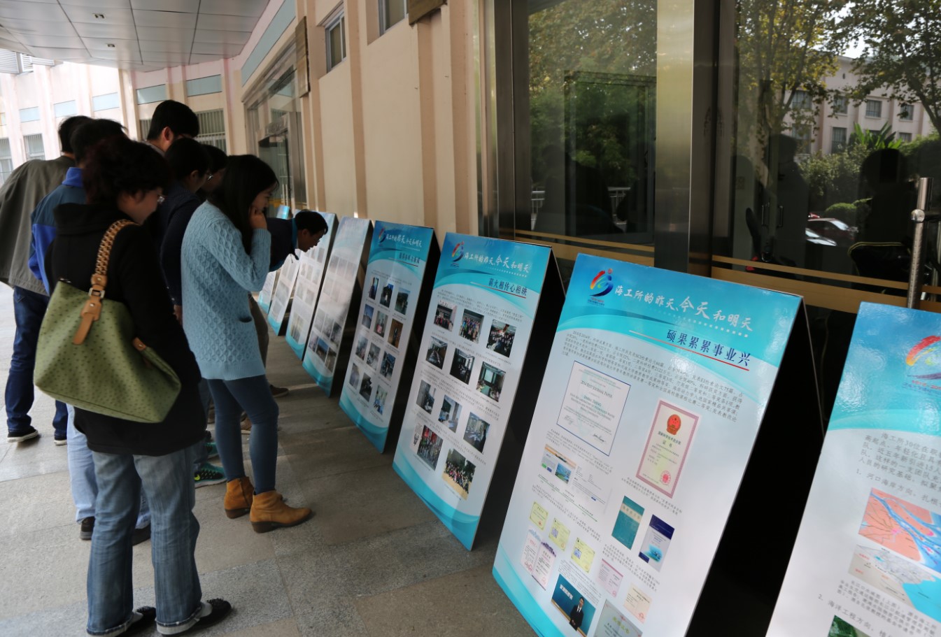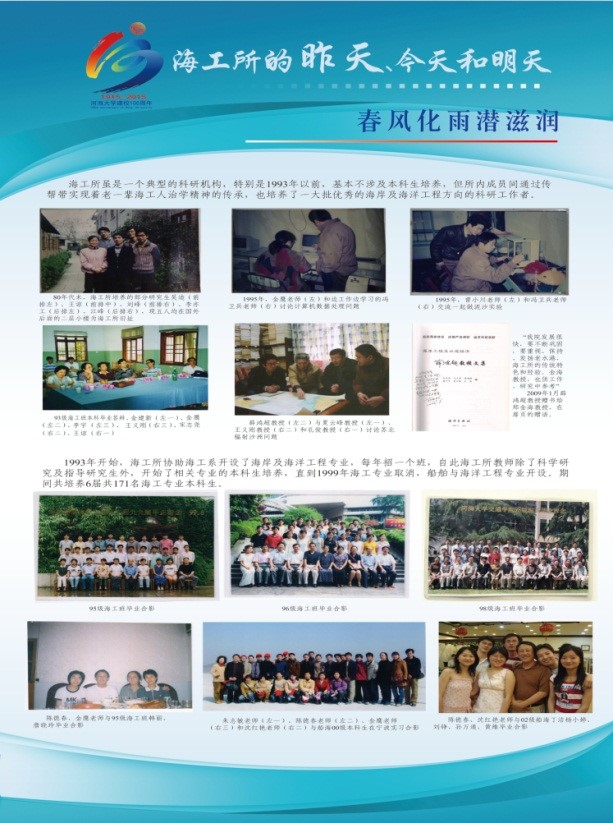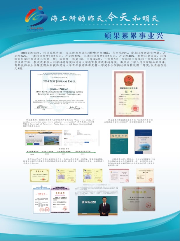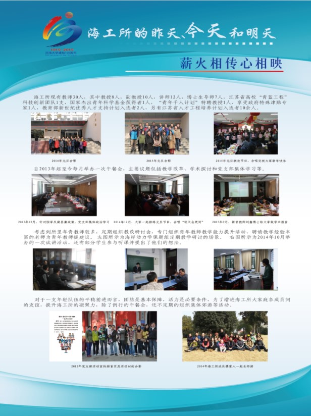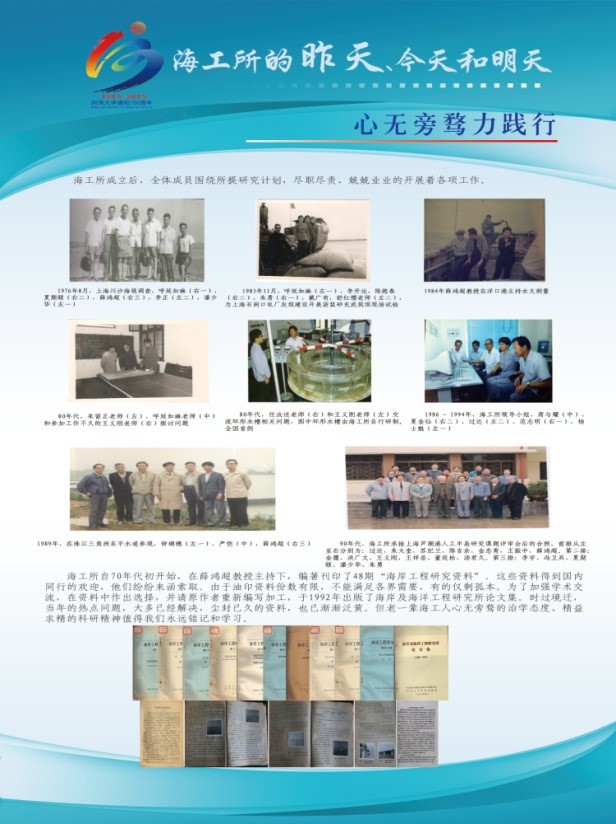 2015年10月25日至31日,港航学院海工党支部在毛巾哥 校党委组织部和港航学院党委的共同支持下,举办了主题为“海工的昨天、今天和明天”的文化展活动。展览过程中,除了海工党支部全体党员专门组织了观展和学习活动外,学校的师生员工以及校庆期间返校的校友们等约三百余人次参与了该活动。本次展览活动旨在通过对海工辉煌历史的梳理,提升海工所全体教师的集体荣誉感;通过对海工文化精神的凝练,实现海工精神的传承与可持续发展;通过对海工过去成绩、现在工作以及未来愿景的展示,促进海工人的自我认可,树立着海工精神在全院以及全校文化建设中的模范形象。