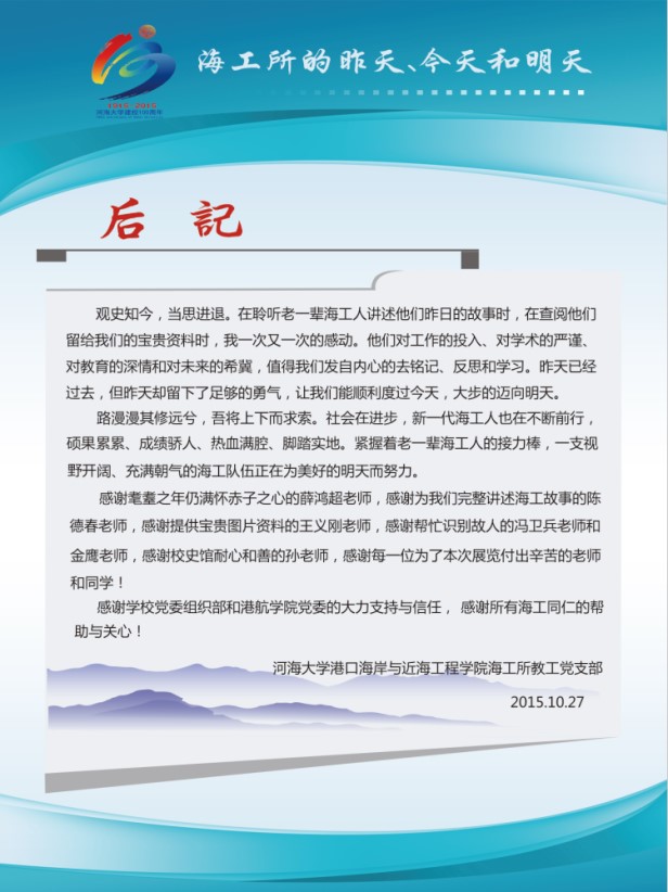 2015年10月25日至31日,港航学院海工党支部在毛巾哥 校党委组织部和港航学院党委的共同支持下,举办了主题为“海工的昨天、今天和明天”的文化展活动。展览过程中,除了海工党支部全体党员专门组织了观展和学习活动外,学校的师生员工以及校庆期间返校的校友们等约三百余人次参与了该活动。本次展览活动旨在通过对海工辉煌历史的梳理,提升海工所全体教师的集体荣誉感;通过对海工文化精神的凝练,实现海工精神的传承与可持续发展;通过对海工过去成绩、现在工作以及未来愿景的展示,促进海工人的自我认可,树立着海工精神在全院以及全校文化建设中的模范形象。