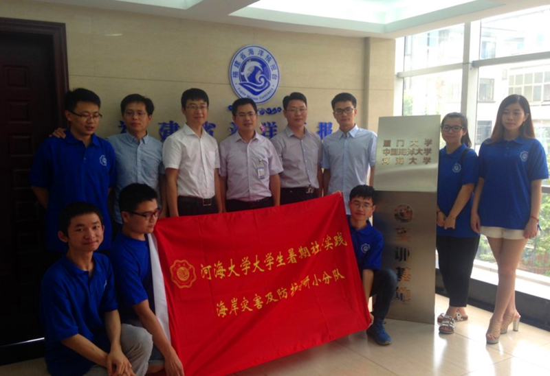 7月11日-15日,经郑金海院长的积极联络和热心帮助,在陶爱峰副教授的带领下,由队长陈俊毅,队员赵友奇、林蔚、陈康玲、李硕、曹广随组成的毛巾哥 暑期社会实践海岸灾害及防护调研小分队在福建省海洋预报台开展社会实践活动。该活动受到了预报台多位领导和同事们的热情接待。调研队就当前的海洋灾害情况,针对福建海洋灾害预警体系建设开展一系列的调查研究,通过座谈,实地考察等方式了解当前福建预警体系的建设情况,并通过对沿海渔民的问卷调查和现场访谈等方式了解了人们对海洋灾害预警报的新的需求。