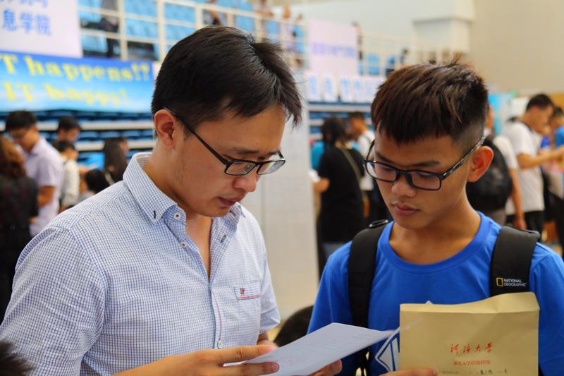 2015级志愿者用热忱与笑容迎接初来乍到的新生们,耐心地发放资料,提供指引,身着统一蓝色服装的他们像清流在炎炎夏日为新生送上援助。