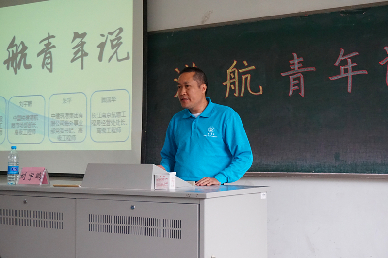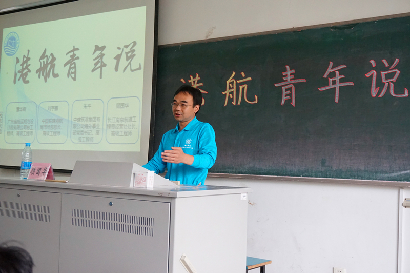 2016年10月15日上午10:30,港航院96届校友,广东省航运规划设计院有限公司总工程师、高级工程师董华钢,中国铁建港航局市场部部长、高级工程师刘宇鹏,中建筑港集团有限公司海外事业部党委书记、高级工程师朱平,长江南京航道工程局经营处处长、高级工程师顾国华返回母校,与百余名本科生相聚一堂,回忆大学生活,分享人生经验。