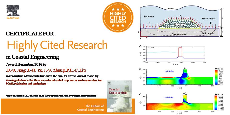 近日,国际化多媒体出版集团爱思唯尔(Elsevier)主办的海岸工程期刊《Coastal Engineering》公布了2016年度高被引论文(Highly Cited Research Paper),张继生教授与Dong-Sheng Jeng教授、Jianhong Ye博士、Philip Li-Fan Liu院士于2013年合作发表的学术论文“An integrated model for the wave-induced seabed response around marine structures: model verifications and applications”入选高被引论文。
