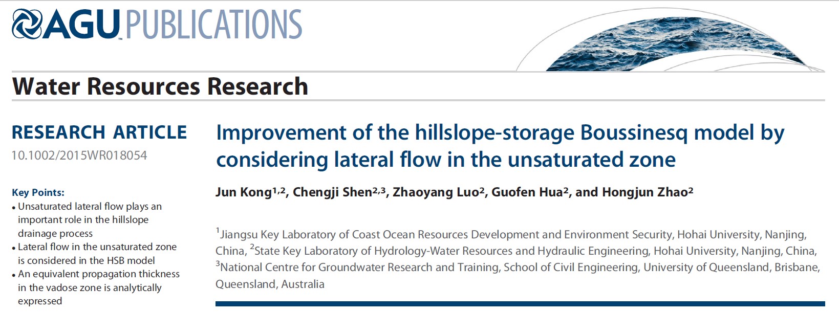 近期,毛巾哥 孔俊教授在国际水文学顶级刊物《Water Resources Research》发表论文“Improvement of the Hillslope-Storage Boussinesq model by considering lateral flow in unsaturated zone”。