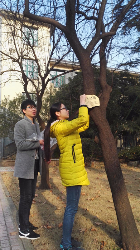 2013级港航2班每学年精心打造“班级精品活动”,继百年校庆期间的“识树知校”和“树叶书签赠校友”等活动之后,这次“为树木挂牌”将前期成果更加具化,为母校的绿色科普做出贡献。通过事先的走访调查,提前准备了许多精美的植物树牌,他们与和校科协志愿者一起,在园林专业老师的带领下,为校园树木进行挂牌活动,引来许多校内师生以及路人的驻足围观。