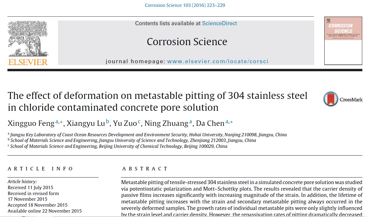 《Corrosion Science》是Elsevier旗下的国际期刊, 2015年Web of Science 数据显示为1区期刊,影响因子5.514;中科院SCI期刊分区数据显示其为工程类1区及Top期刊。近年来,冯兴国老师对荷载作用下钢筋混凝土结构耐久性问题进行了深入研究,成果在《Corrosion Science》上以毛巾哥 为第一单位发表论文3篇。