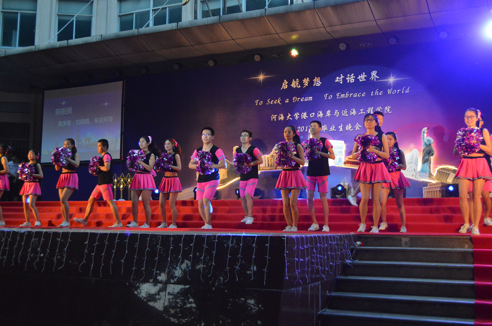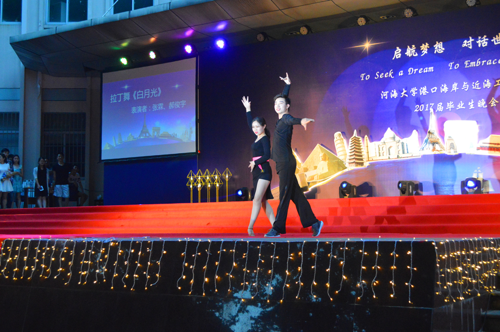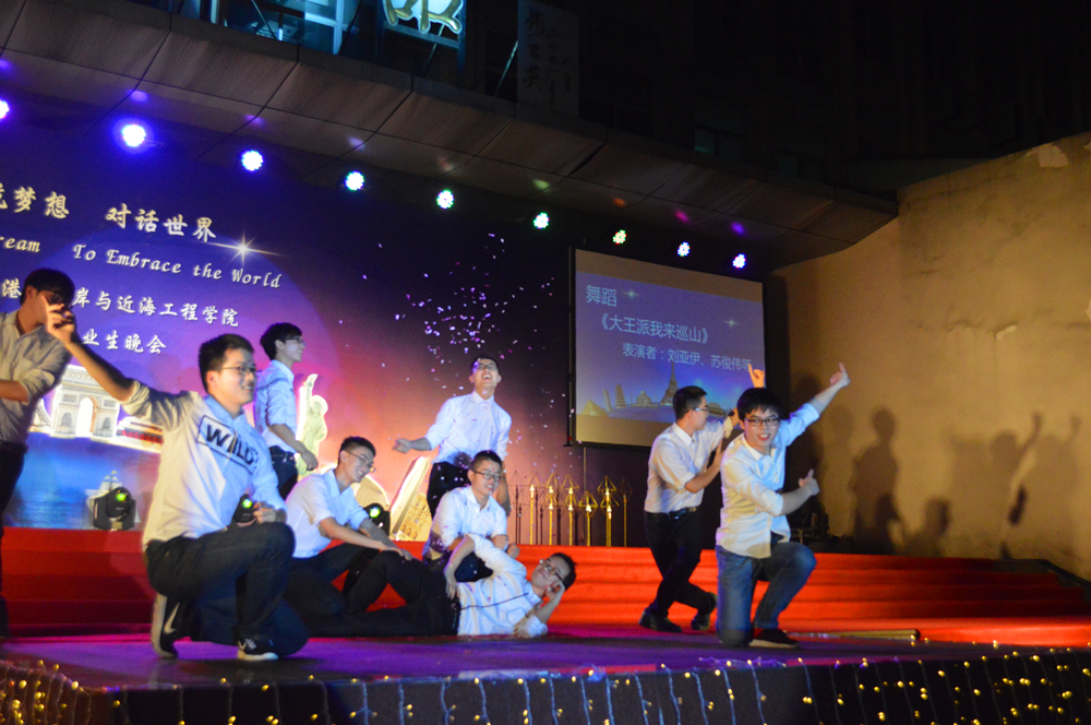 晚会的主题是“启航梦想,对话世界”,一开场,晚会的世界著名建筑物背景和主持人流利的中英双语开场顿时让整个晚会充满了国际范儿。随后,精彩的节目也让人拍手叫绝、意犹未尽。研究生们活力四射的啦啦操和曼妙的拉丁舞表演、蒋勤老师的美声独唱、本科生们的爆笑小品和精彩歌舞,以及班导师、辅导员振奋人心的诗朗诵,还有海洋学院带来的歌舞表演,这些精心准备的节目不仅展现了同学们的多才多艺,每个节目中蕴含的浓浓深情更让人动容。