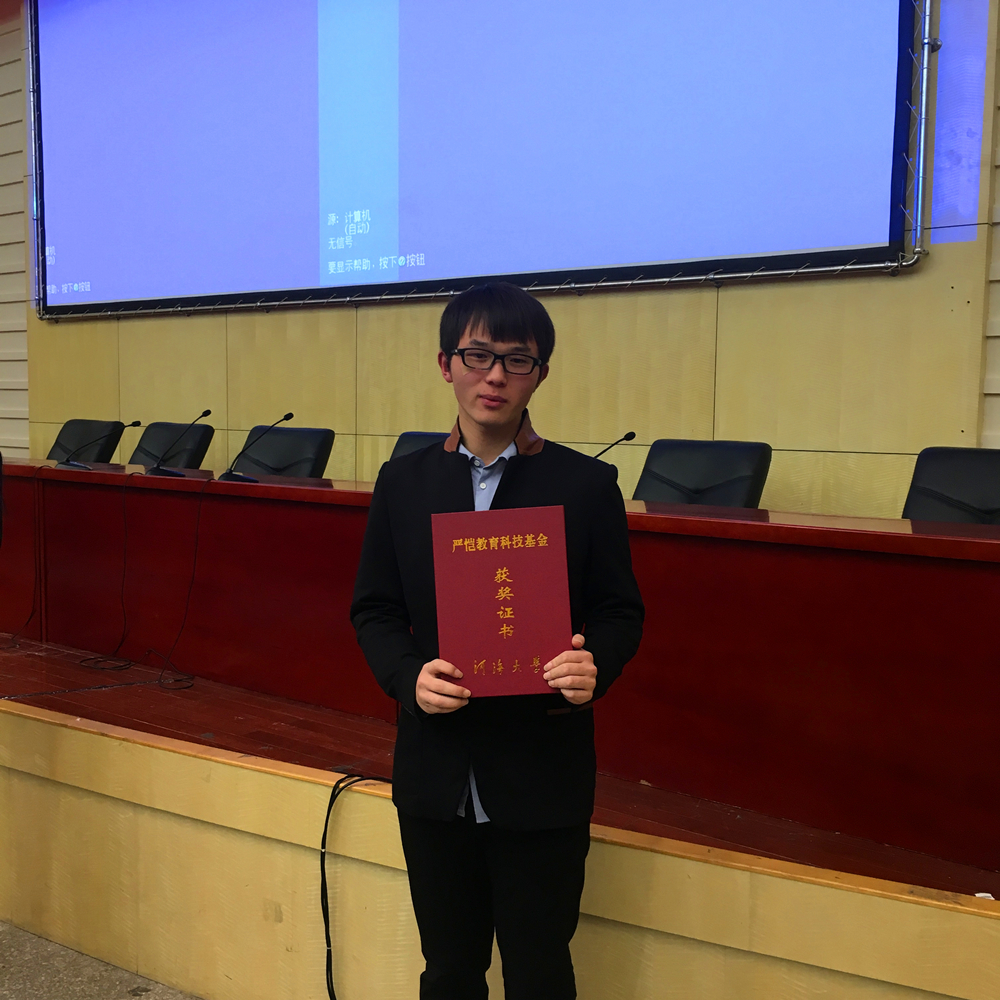优秀学生奖学金”、“第十届全国周培源大学生力学竞赛优秀奖”、“全国大学生数学建模江苏赛区一等奖”、“第六届全国大学生数学竞赛预赛二等奖”、“第九届江苏省大学生力学竞赛二等奖”、“江苏省第十二届高等数学竞赛本科组二等奖”等,大学生创新训练计划国家级水利实验中心项目成员,在水运交通类核心期刊《中国水运》2016年第16卷第7期上发表论文1篇,申请并授权国家实用新型专利4项,实用新型专利“一种利用水流发电的节能一体化装置”(第一发明人)、实用新型专利“一种水流能源转换装置”(第一发明人)、实用新型专利“一种混凝土专用的搅拌装置”(第二发明人)、实用新型专利“一种悬浮装置”(第三发明人)。申请并进入实审国家发明专利1项,发明专利“一种用于装砂施工技术中的充填式土工充砂带”(第二发明人)。现已推免至浙江大学读研。
