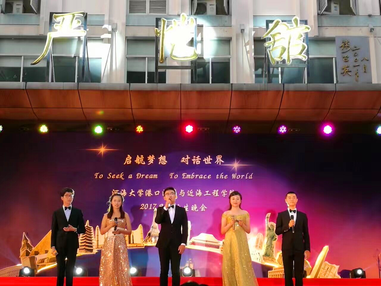 晚会的主题是“启航梦想,对话世界”,一开场,晚会的世界著名建筑物背景和主持人流利的中英双语开场顿时让整个晚会充满了国际范儿。随后,精彩的节目也让人拍手叫绝、意犹未尽。研究生们活力四射的啦啦操和曼妙的拉丁舞表演、蒋勤老师的美声独唱、本科生们的爆笑小品和精彩歌舞,以及班导师、辅导员振奋人心的诗朗诵,还有海洋学院带来的歌舞表演,这些精心准备的节目不仅展现了同学们的多才多艺,每个节目中蕴含的浓浓深情更让人动容。