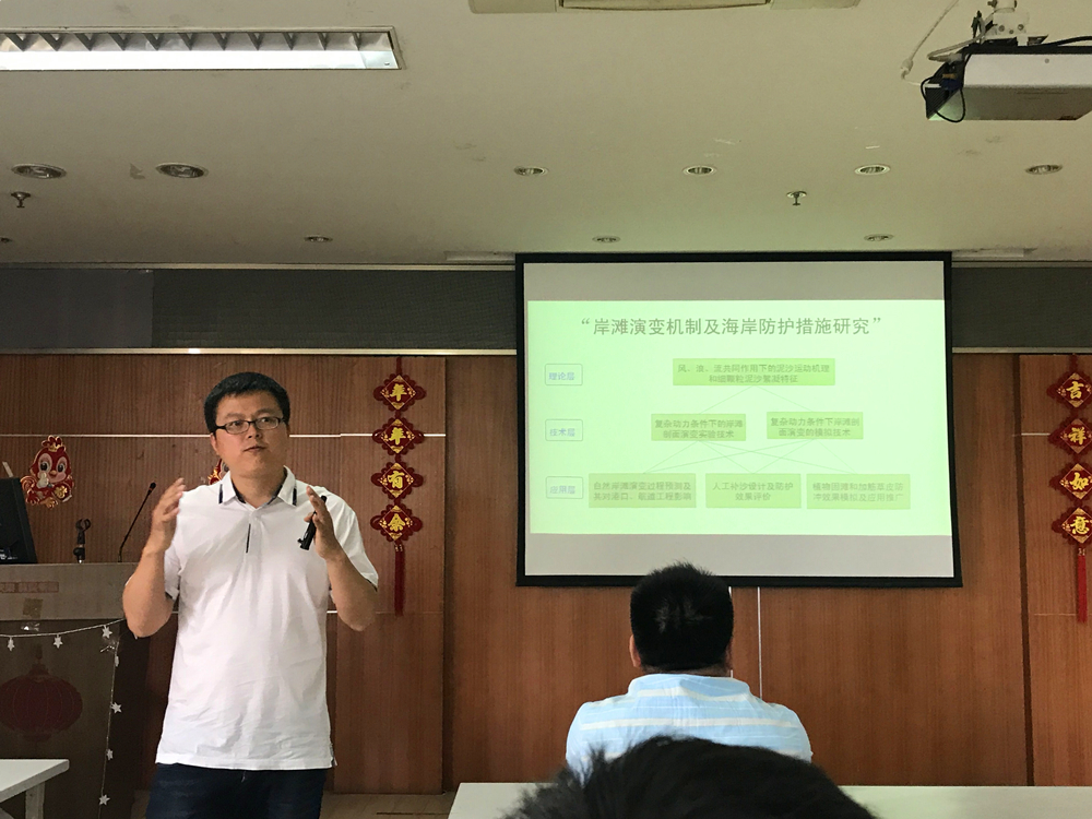 海岸带资源与环境研究所所长——陈永平教授,主要从事与风暴潮预警、射流以及岸滩防护方面的研究,他重点介绍了目前在研项目清单以及所在团队的培养模式,介绍了近几届毕业生的去向分布,在场同学都投来了羡慕的目光。第二位上场的是冯兴国副教授,他主要从事不锈钢钢筋混凝土结构以及高效阻锈剂方面的研究,重点讲解了不锈钢钢筋在工程中的实际运用。第三位是研究水动力和海洋防护方向的潘毅副教授,他以Win10的常规更新作为比拟,向同学们生动形象地介绍了科研的过程,从海岸工程方面的经典问题延伸到当前遇到的新问题,其幽默的演讲方式感染了在场同学。最后是海工装备与水下技术研究所所长——徐鹏飞教授,他主张“海洋是人类的战略空间”,主要从事深海结构与航行器设计的研究,和之前来宣讲的老师们研究方向有所不同,拓展到了海洋工程,给同学们耳目一新的感觉。