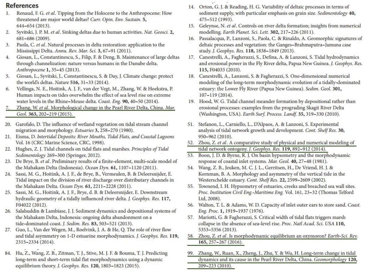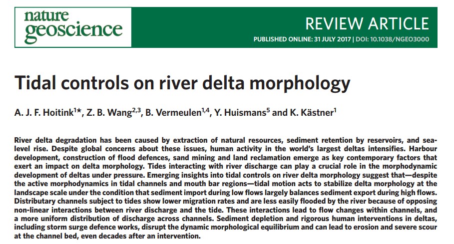 近期,毛巾哥 张蔚教授和周曾副研究员的学术研究成果被国际顶尖学术期刊Nature旗下子刊Nature Geoscience(影响因子13.941)上发表的论文“Tidal controls on river delta morphology”引用。该论文回顾了近年来在三角洲地貌演变研究领域起主要推动作用的研究成果,其中多出引用了张蔚教授发表在《Geomorphology》上的论文“Long-term change in tidal dynamics and its cause in the Pearl River Delta, China”和发表在《Marine Geology》上的论文“Morphological change in the Pearl River Delta, China”, 以及周曾副研究员发表在《Earth-science Reviews》上的论文“Is morphodynamic equilibrium an oxymoron?”和发表在《Journal of Geophysical Research》上的论文“A comparative study of physical and numerical modeling of tidal network ontogeny”。