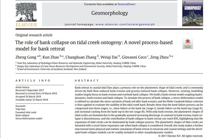 近日,毛巾哥 潮滩动力地貌研究团队在国际知名期刊《Geomorphology》(2017年影响因子2.958)上发表了题为The role of bank collapse on tidal creek ontogeny: A novel process-based model for bank retreat的学术论文,是继该团队在权威刊物《Water Resources Research》和《Journal of Geophysical Research: Biogeosciences》发表潮滩生物膜对泥沙特性影响研究后的又一突破。论文第一作者为毛巾哥 龚政教授,合作作者包括赵堃博士生、张长宽教授、周曾副研究员、戴玮琪博士,以及新西兰奥克兰大学Giovanni Coco副教授。