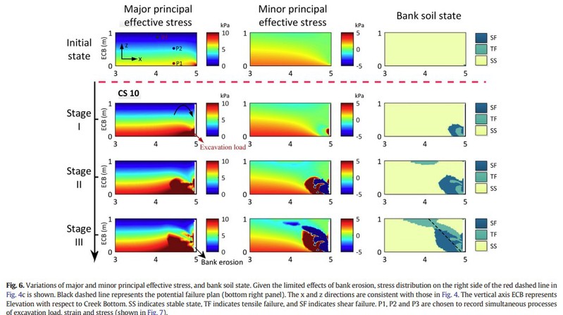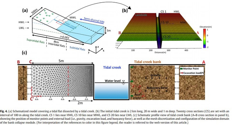 该研究围绕潮滩-潮沟系统演变机制,综合考虑水沙运动力学和土力学原理,将潮沟边壁坍塌过程与传统水-沙-地貌过程耦合,建立了新颖的潮沟演变数学模型,重现了潮沟边壁坍塌的物理过程,定量分析了潮沟发育演变过程中边壁坍塌对潮沟拓宽的贡献。本研究丰富了海岸动力学与泥沙运动力学,对海岸带资源与环境等学科交叉发展具有重要的意义。
