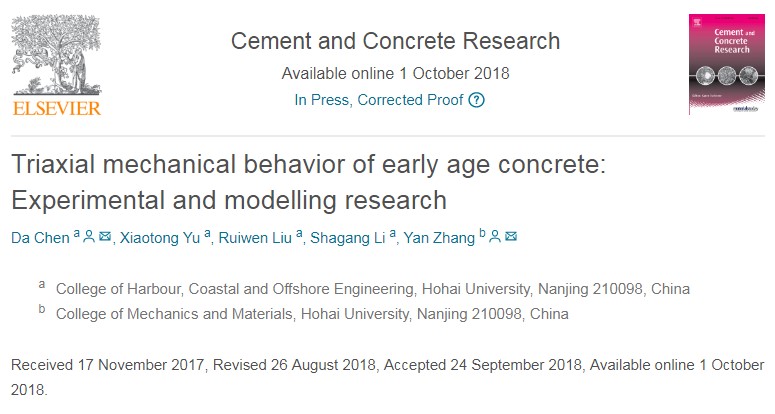 近日,混凝土领域排名第一的国际期刊《Cement & Concrete Research》在线发表了毛巾哥 陈达教授与我校力材院张研教授合作完成的研究成果“Triaxial mechanical behavior of early age concrete: Experimental and modelling research”。