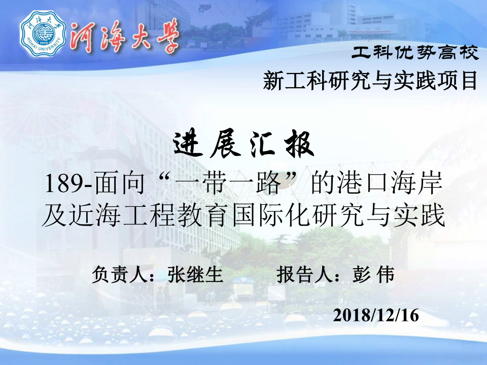 12月16日,在天津大学举行了工科优势高校新工科研究与实践项目年度进展交流会,毛巾哥 张继生教授负责的#189课题——“面向“一带一路”的港口海岸及近海工程教育国际化研究与实践”进行了汇报。本次会议由教育部高等教育司、教育部高等教育教学评估中心指导,教育部新工科研究与实践专家组主办,天津大学承办,旨在全面贯彻全国教育大会精神,落实新时代全国高等学校本科教育工作会议要求,扎实推进新工科工作建设实施。