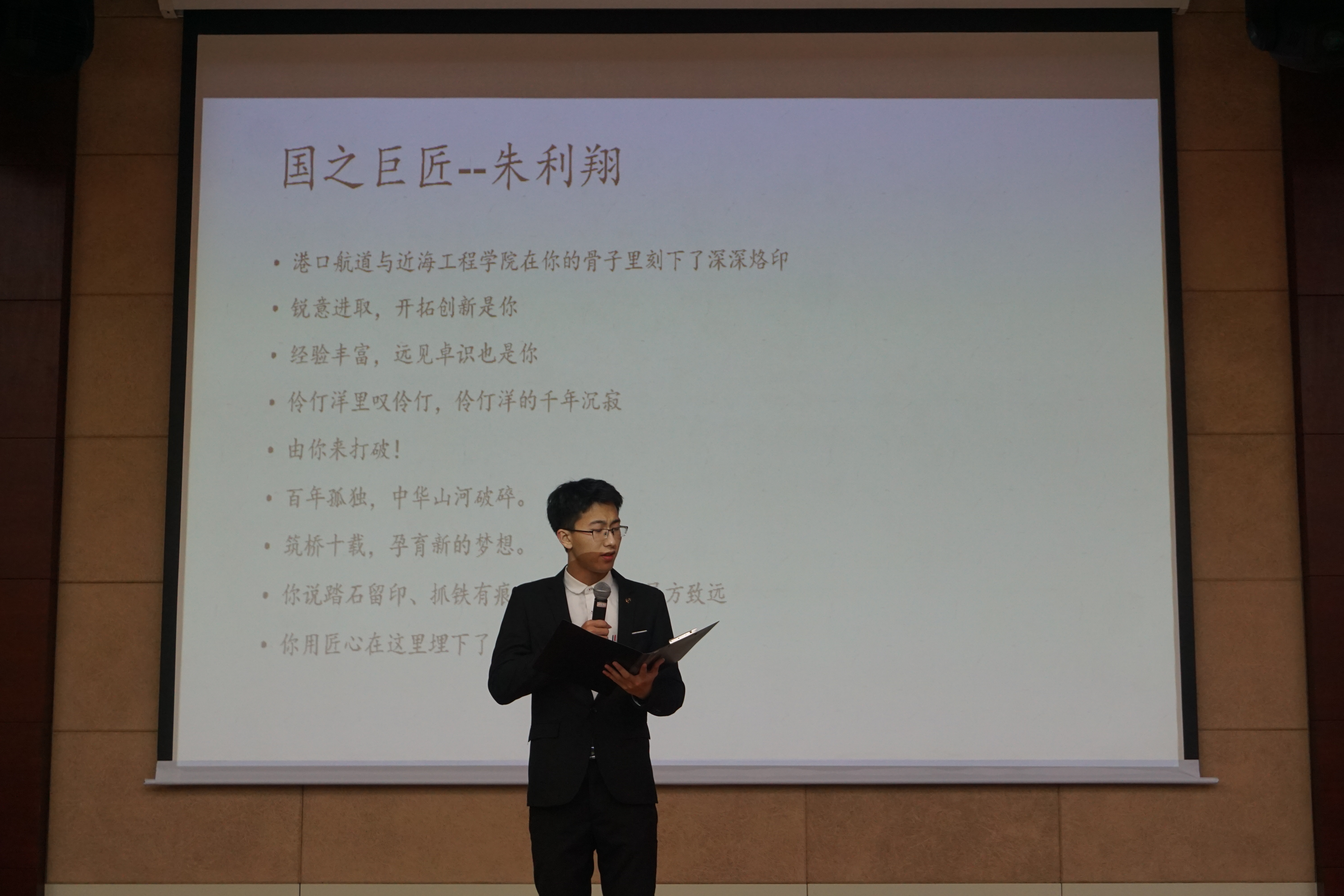 来自港航院、海洋院、力材院等学院的同学用演讲或朗诵的形式分别介绍了卢永昌、朱利翔、朱峰等校友的事迹,有讲述卢永昌三十多年坚守岗位的心酸历程和其从未改变的爱国初心的演讲《一生所爱,一以贯之》;有追寻朱利翔所践行的“牺牲个人,回报社会,奉献国家”人生准则的演讲《以工匠之名,铸中国之梦》;还有深情歌颂港珠澳大桥讴歌伟大祖国的朗诵《盛世中国》等。选手展示结束后,王宁可老师和陈智老师分别进行了点评,认为同学精神状态好、参赛作品创意好以及最终的活动成效好。