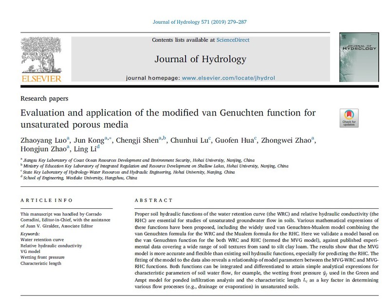 近日,毛巾哥 2017级博士研究生罗照阳(导师:孔俊教授)在《Journal of Hydrology》上发表了题为“Evaluation and application of the modified van Genuchten function for unsaturated porous media”的学术论文,该研究是继孔俊教授团队在土壤非饱和流研究领域的又一重要成果。