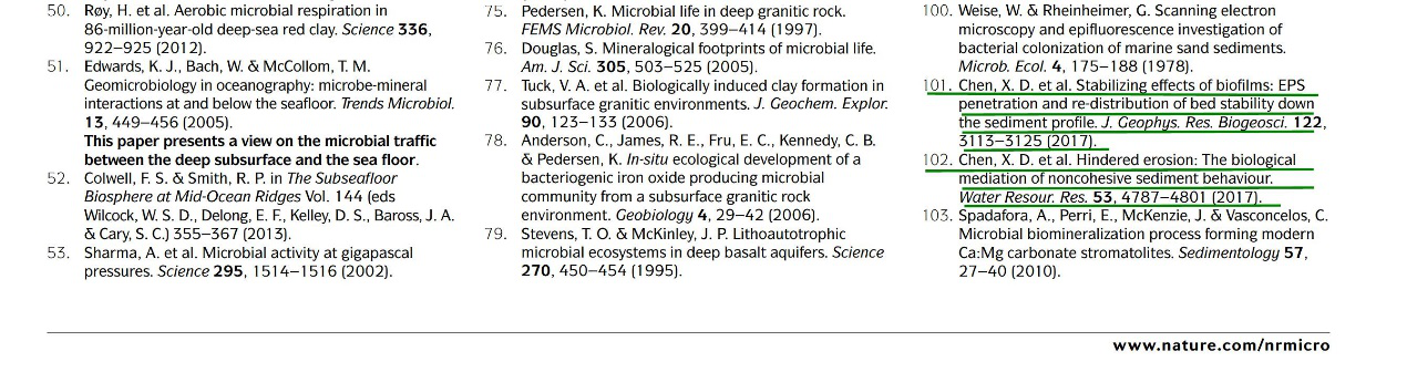 潮滩动力地貌团队2017年发表的两篇关于潮滩泥沙生物稳定性的研究成果均被引用,其分别为发表在一区期刊《Water Resources Research》上的论文“Hindered erosion: The biological mediation of noncohesive sediment behavior”和发表在二区期刊《Journal of Geophysical Research: Biogeosciences》上的论文“Stabilizing Effects of Bacterial Biofilms: EPS Penetration and Redistribution of Bed Stability Down the Sediment Profile”。论文第一作者为陈欣迪博士生,其导师是张长宽教授。论文的合作作者包括毛巾哥