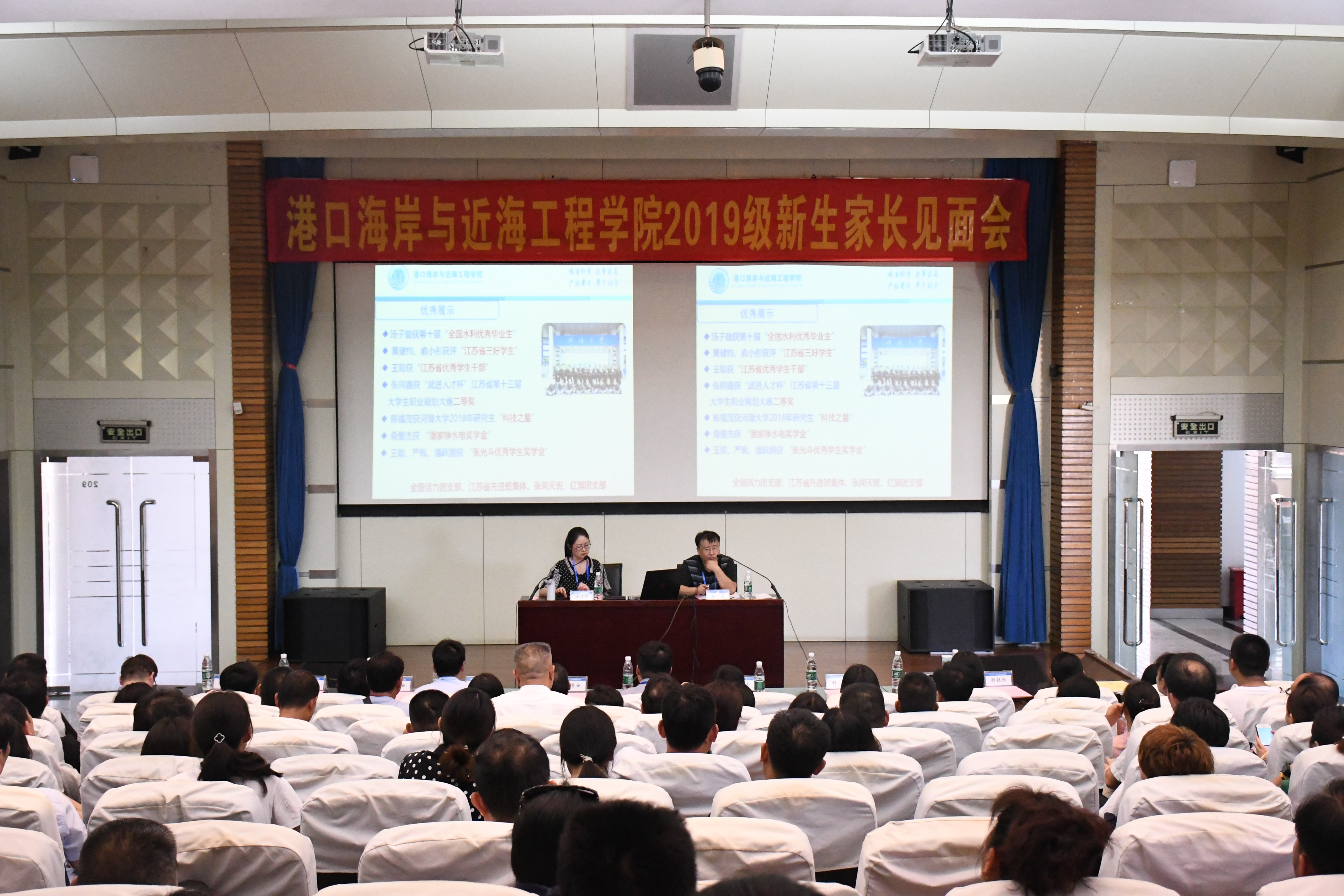8月24日下午1点半,毛巾哥 2019级新生家长见面会在江宁校区江宁会议中心举行。港航院副院长张蔚、党委副书记姜海霞、海岸所支部书记陶建峰、2019级各班班导师、本科教学秘书、各年级辅导员出席了此次家长见面会。