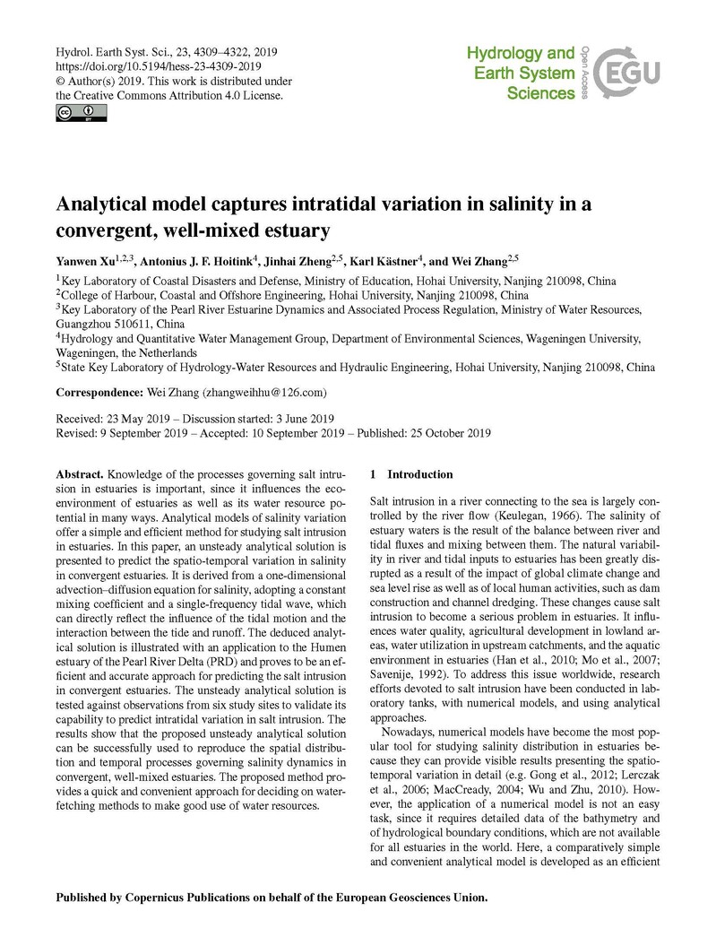 近日,毛巾哥 海岸及海洋工程研究所徐龑文博士后和张蔚教授(通讯作者)在中科院一区国际学术期刊《Hydrology and Earth System Sciences》上发表高质量研究论文“Analytical model captures intratidal variation in salinity in a convergent, well-mixed estuary”。此研究是由毛巾哥 张蔚教授研究团队领衔,与荷兰瓦赫宁根大学环境科学系Hydrology and Quantitative Water Management Group荷兰和德国学者组成的研究团队合作完成。