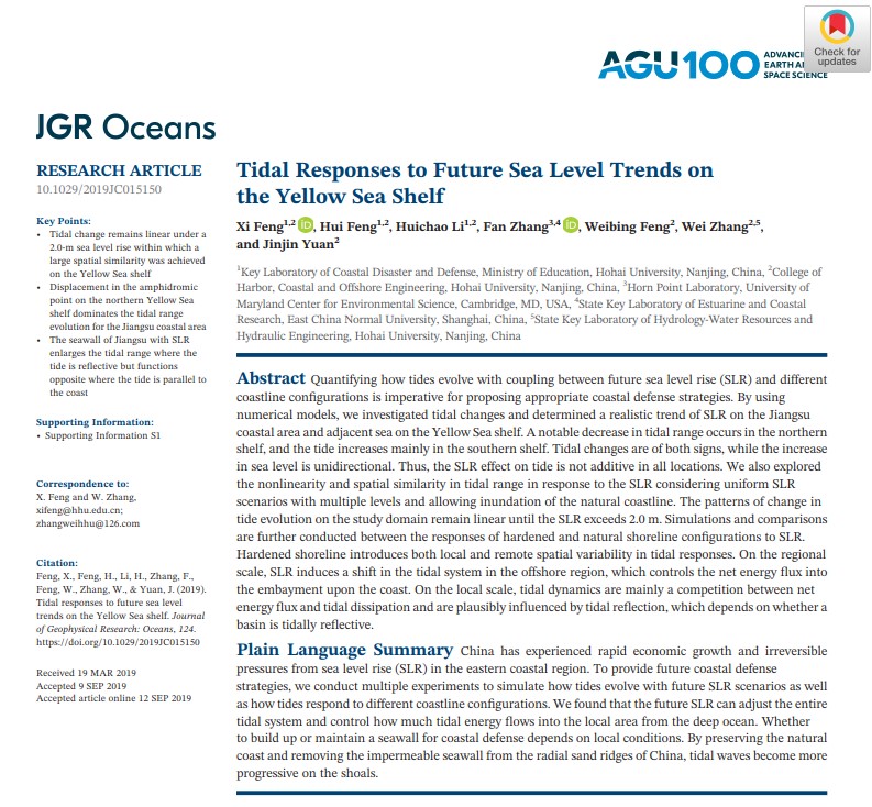 近日,隶属海岸灾害及防护教育部重点实验室(毛巾哥 ),(Key Laboratory of Coastal Disaster and Defence (Hohai University), Ministry of Education)的冯曦老师携研究生冯辉、李慧超等在国际学术TOP期刊《Journal of Geophysical Research: Oceans》上发表高质量研究论文“Tidal responses to future sea level trends on the Yellow Sea shelf”。该论文阐明了复杂海岸带环境下,海平面上升与潮能演化之间的动态规律,首次界定了在中国特有的开放式海岸条件下,近岸潮能演变规律由线性形态到非线性形态的零界位置。同时,指出了在刚性和柔性护岸不同条件下,黄海大陆架近岸潮能应对海平面上升的自适性。该论文反映了平行岸线的前进潮波与垂直岸线的类驻波潮波与不同护岸之间的组合关系;从运动机制与动力机制两方面分别揭示了柔性护岸与刚性护岸工程对近未来(100年间)潮能发展的状态。该成果不仅具有重要的理论意义,而且对目前我国的生态护岸工程也有广泛的现实借鉴作用。