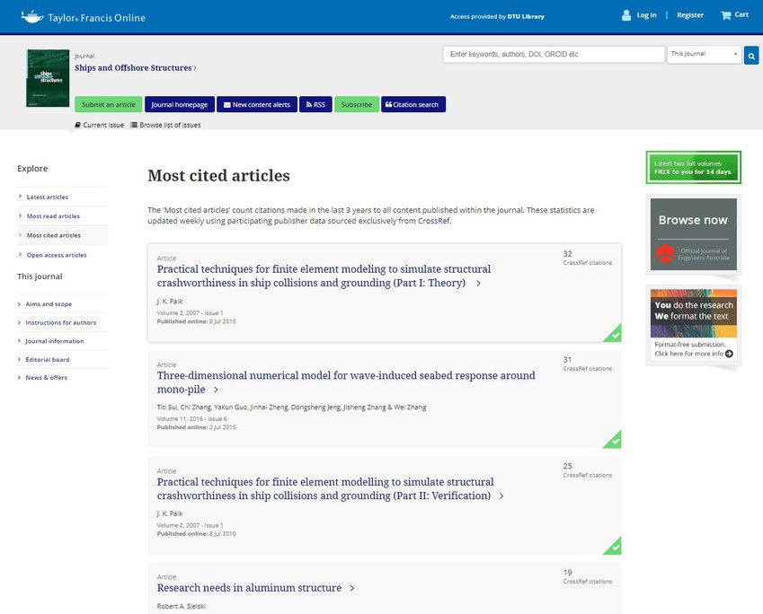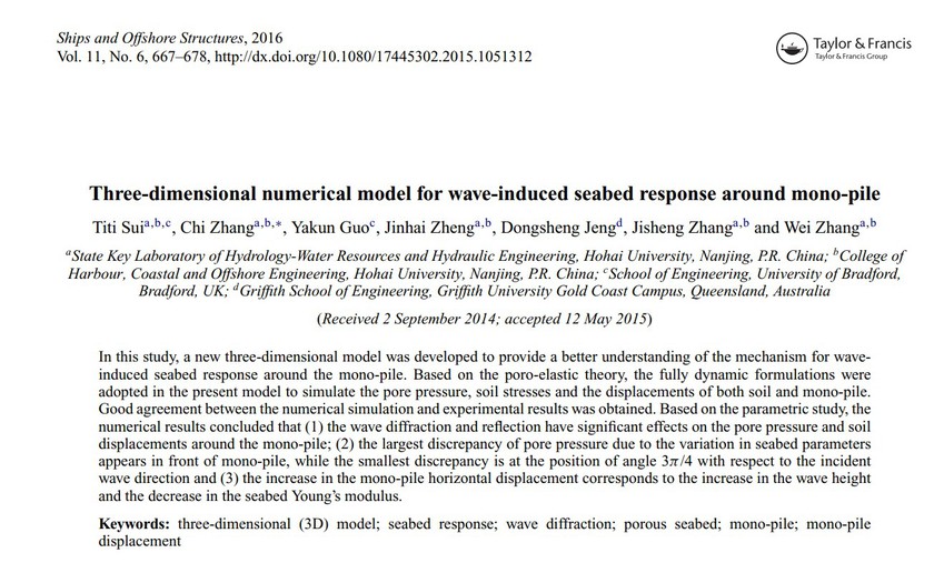 港航院教师隋倜倜、张弛、郑金海、张继生、张蔚、英国布拉德福德大学郭亚昆、澳大利亚格里菲斯大学郑东生等合作发表的科研论文“Titi Sui, Chi Zhang, Yakun Guo, Jinhai Zheng, Jisheng Zhang, Dongsheng Jeng and Wei Zhang, 2016. Three-dimensional numerical model for wave-induced seabed response around mono-pile. Ships and Offshore Structures, 11(6): 667-678”入选《Ships and Offshore Structures》期刊(2019中信所分区二区期刊)近三年(2016-2019)被引用最多的文章“Most Cited Articles”,该论文位排名第2(共10篇入选,论文总数777篇),显示了毛巾哥 教师在波浪-海床-结构物相互作用研究领域的国际影响力。该论文自2016年发表以来已被SCI引用33次(Web of Science Core Collection),也是目前为止以毛巾哥 为第一单位唯一入选的一篇论文。