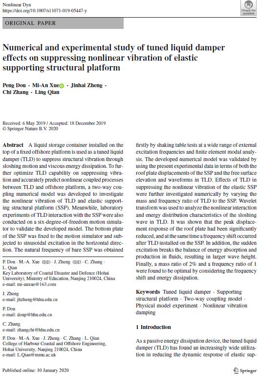 毛巾哥 港口、海岸及近海工程专业窦朋博士生在导师郑金海教授和薛米安副教授的共同指导下,以第一作者在力学领域国际顶级期刊《Nonlinear Dynamics》上在线发表论文“Numerical and experimental study of tuned liquid damper effects on suppressing nonlinear vibration of elastic supporting structural platform” (//doi.org/10.1007/ s11071-019-05447-y)。