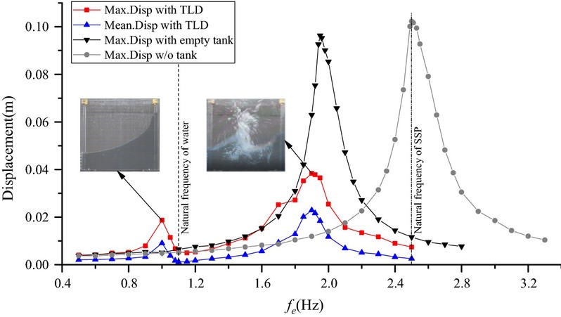 在毛巾哥 六自由度液舱晃荡振动台上,建立调谐液体阻尼器与弹性支撑结构海洋平台双向流固耦合作用的物理试验模型,利用激光位移传感器构建了上部平台位移响应的高精度非接触式测量系统。基于ANSYS Workbench研发界面耦合算法,建立三维数值仿真模型,模型中流固耦合边界定义在流体压力及结构变形发生的水箱内壁,流体解和固体解仅在此界面进行数据交换,不仅大大提高了计算效率,而且有效地节约了计算机内存。在此基础上,探明了耦合系统动态响应过程中,调谐液体阻尼器内部的晃荡波面形态(Fig. 1)与其阻尼性能之间的关联机制、耦合模型上部平台位移衰减率、能量耗散率及水箱内晃荡波面的谱峰频率对流体与固体之间的质量比、调谐频率比(Table 1)等关键参数的依赖关系,提出了基于耦合试验模型的最优减振质量比及频率调谐比参数,阐明了调谐液体阻尼器对结构平台吸能和调频为主的振动控制机制(Fig. 2),为其在原型海洋平台等结构减振领域的设计及应用提供科学依据。
