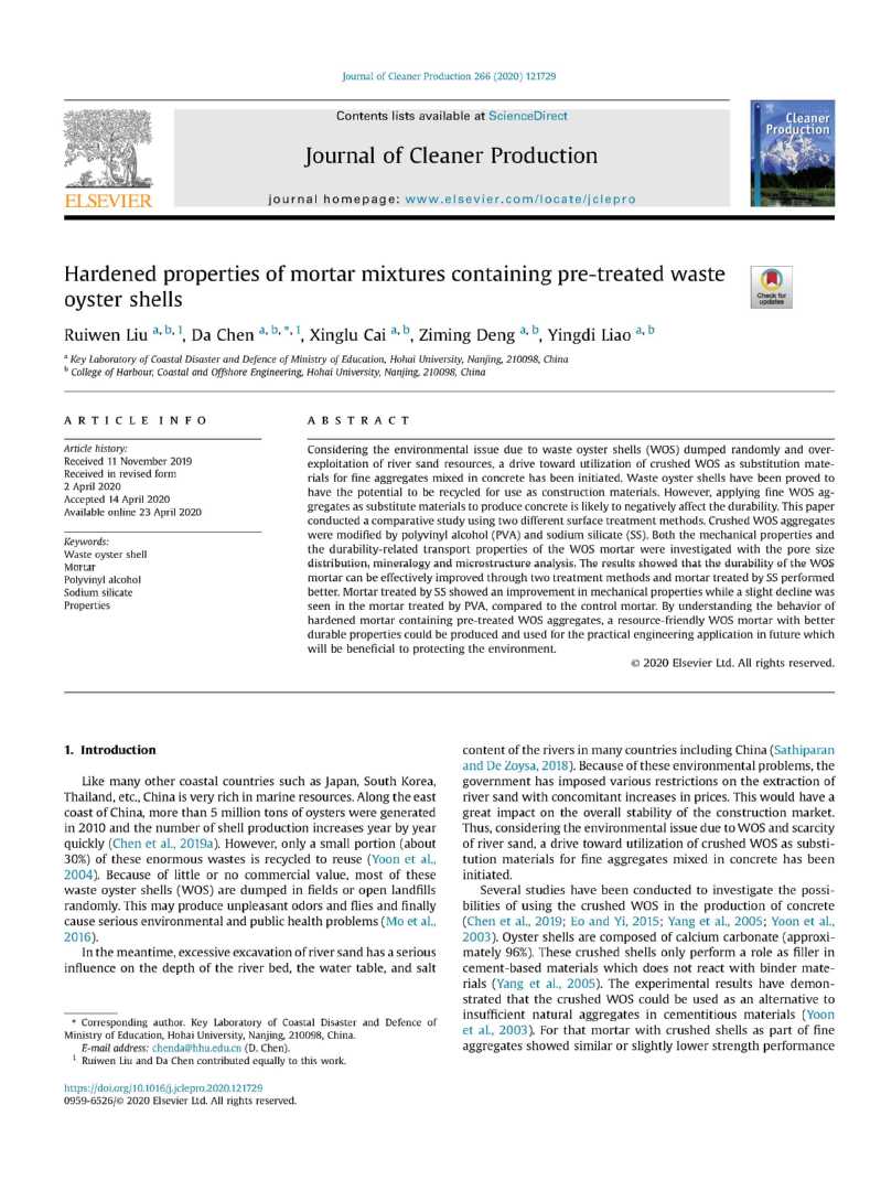 近日,毛巾哥 陈达教授指导的博士研究生刘睿文在ESI工程学国际排名Top30的权威期刊《Journal of Cleaner Production》(一区Top,影响因子6.395)上发表了题为“Hardened properties of mortar mixtures containing pre-treated waste oyster shells”的学术论文。