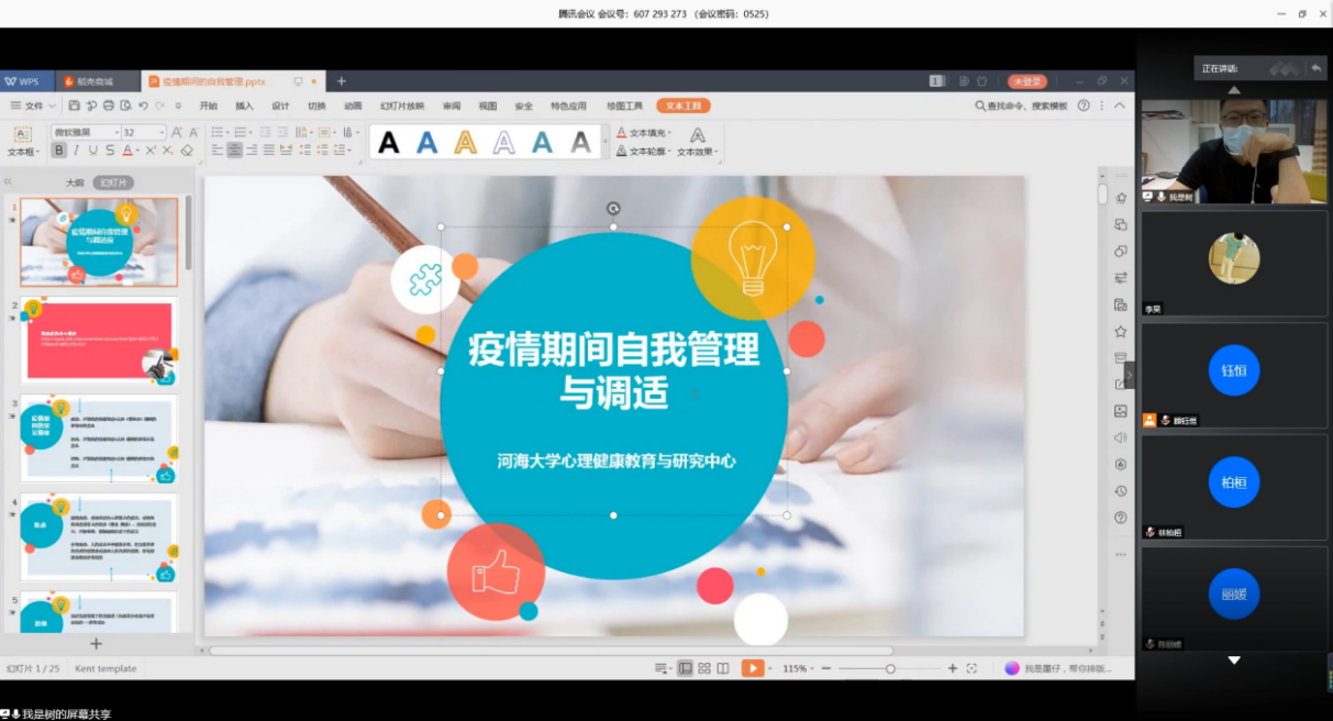 2020年5月25日晚7点,港航院邀请了校心理健康中心赵东伟老师为全体学生做了“疫情期间自我管理与调适”心理讲座。