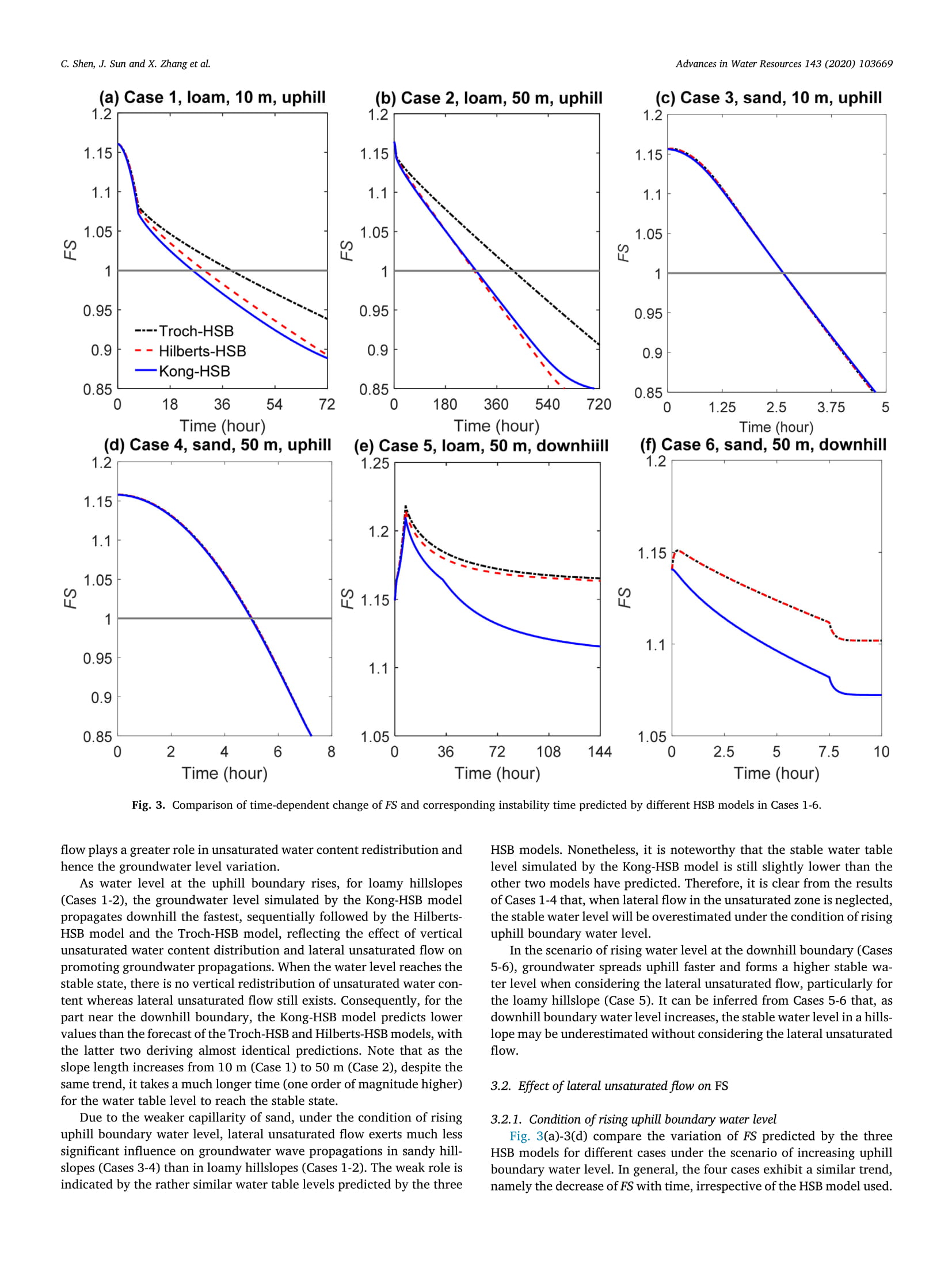 滑坡是地质灾害的一种,不仅造成巨大的经济损失,更造成每年数千人员受伤或死亡。因此,准确评估坡面稳定性进而提前预报滑坡的发生成为研究人员关注的重点。本文基于孔俊教授2016年提出的Kong-HSB理论,研究了当边界水位变化引发滑坡时,侧向非饱和流对滑坡的影响。研究结果表明,当上坡边界水位抬升时,对于坡度适中的壤土坡来说,考虑侧向非饱和流的影响会导致滑坡较早发生。此外,对于轻度倾斜的壤土坡,侧向非饱和流不会加快滑坡的产生,而当坡度较陡时滑坡在侧向非饱和流产生作用之前便已发生。与壤土坡相比,侧向非饱和流对沙质坡的破坏影响不大。另外,当上坡边界水位抬升较快时,侧向非饱和流对边坡初始破坏的影响更大,并且强降雨可以削弱侧向非饱和流对浅层滑坡的触发作用。