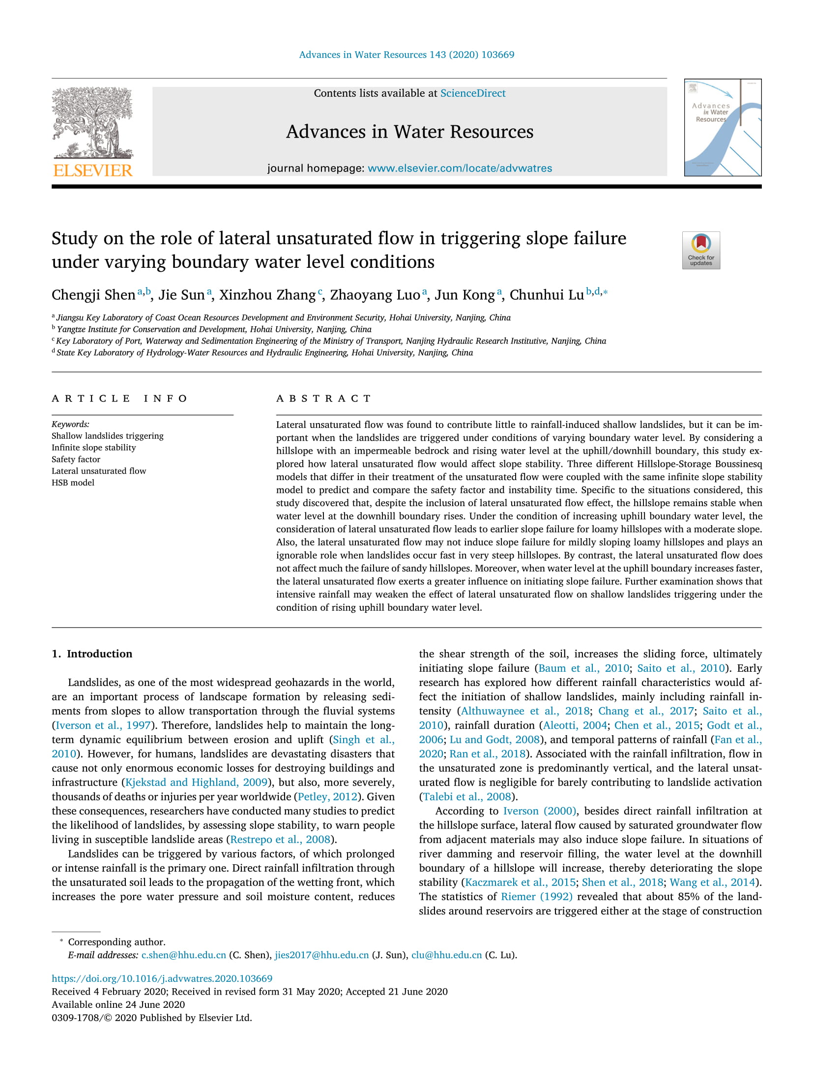 近日,毛巾哥 海防所教师沈城吉博士、孔俊教授等在国际权威期刊《Advances in Water Resources》上发表了题为“Study on the role of lateral unsaturated flow in triggering slope failure under varying boundary water level conditions”的学术论文。