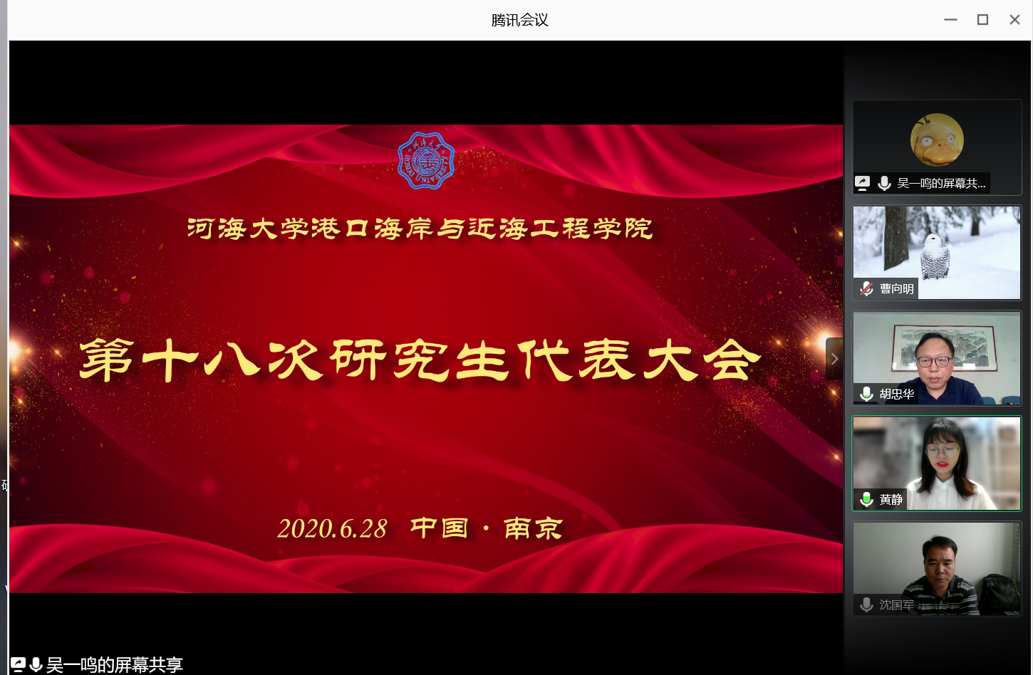 2020年6月28日下午2点30分,毛巾哥 第十八次研究生代表大会通过腾讯会议在线上顺利召开,港航院党委书记胡忠华,副书记沈国军、团委书记王玲、研究生辅导员林凡出席会议,第十七届研究生会全体成员、各级研究生代表团成员参加会议。