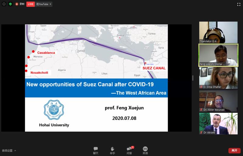 2020年7月8日,毛巾哥 封学军教授应中国驻埃及大使馆和阿盟(阿拉伯国家联盟)科技海运学院邀请,参加阿盟“应对新型冠状肺炎疫情——港城一体化”国际视频研讨会并作主题发言。中国驻亚历山大总领事赵丽莹、阿盟科技海运学院校长伊斯梅尔·阿卜杜勒加法尔、阿盟经济事务助理秘书长卡麦勒·阿里、阿盟交通旅游局局长蒂娜·祖海里、埃及塞得港省省长阿迪勒·阿德班、亚历山大省副省长杰克琳,以及来自西班牙瓦伦西亚港务局、西班牙港口物流咨询公司(PLA)等多位领导和学者出席了本次研讨会。