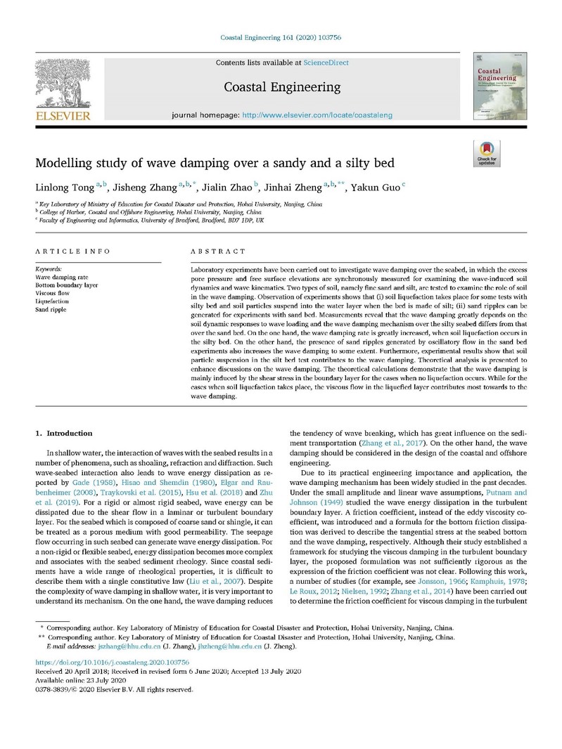 近日,毛巾哥 童林龙博士后与合作导师郑金海教授、张继生教授在海岸工程类顶级期刊《Coastal Engineering》(毛巾哥 A类期刊,中信所1区,影响因子4.119)上发表题为:“Modelling study of wave damping over a sandy and a silty bed”的研究论文。