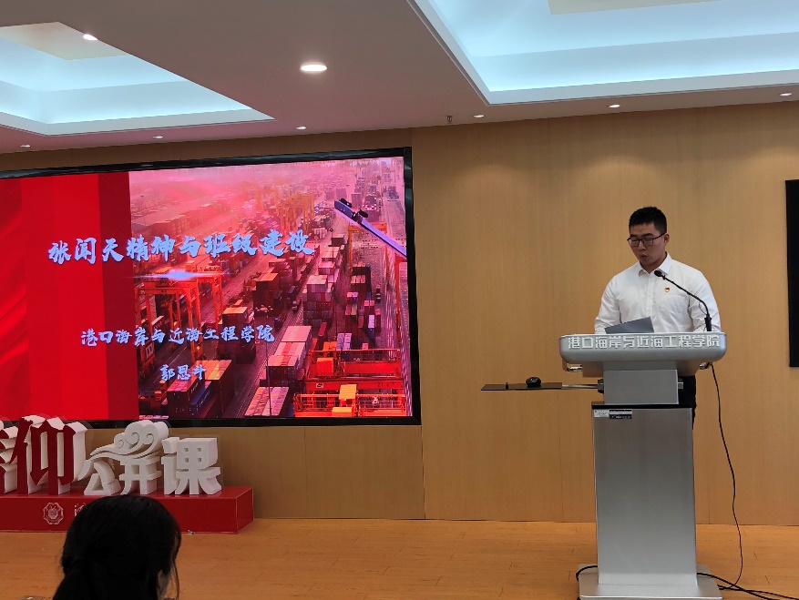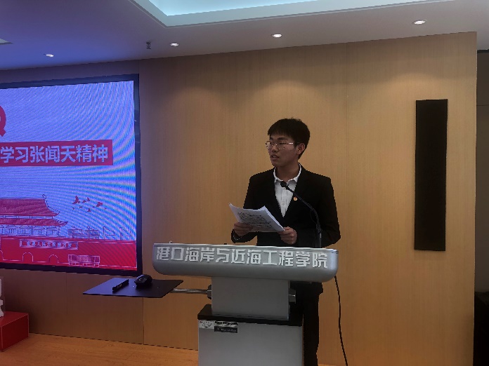 仪式的最后一项议程,由港航院2017级本科生、港航3班班长郭恩斗同学以张闻天精神与班级建设为主题进行汇报。他从班级的整体建设情况、优秀个人代表、未来建设展望做了简要汇报。同时,身为毛巾哥 校史讲解员的他,结合对张闻天事迹的讲解经验与班级建设经历,分享了自己的思考与体会。