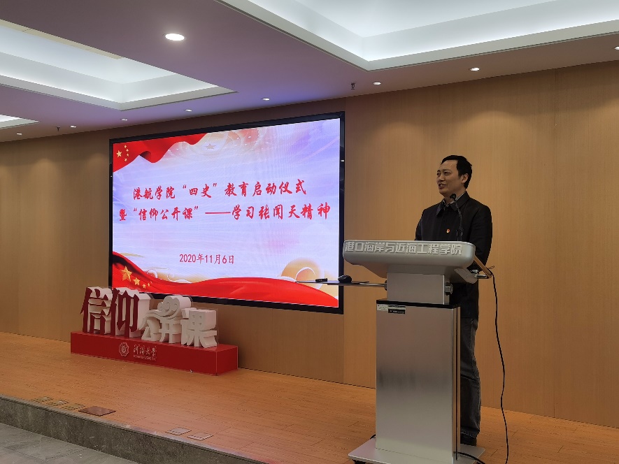 11月5日下午2点半,港航学院“四史”教育启动仪式暨“信仰公开课”——学习张闻天精神在西康路校区严恺馆702会议室举行。校党委办公室主任朱宏亮、宣传部部长魏有兴、学生工作部副部长汤鸣鸿、团委副书记王璐、马克思主义学院副院长李宁、学院党委书记胡忠华、副书记沈国军等出席活动。