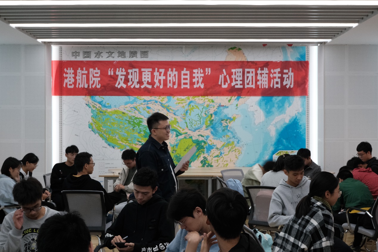 2020年11月11日下午16时,港航院在江宁校区思源楼112开展港航院“发现更好的自我”心理团辅,从“自我探索”和“心理赋能”两个主题中帮助学生认识自我。校心理中心赵东伟老师、港航院19级辅导员廖芳艺老师以及学院各年级同学参与活动。
