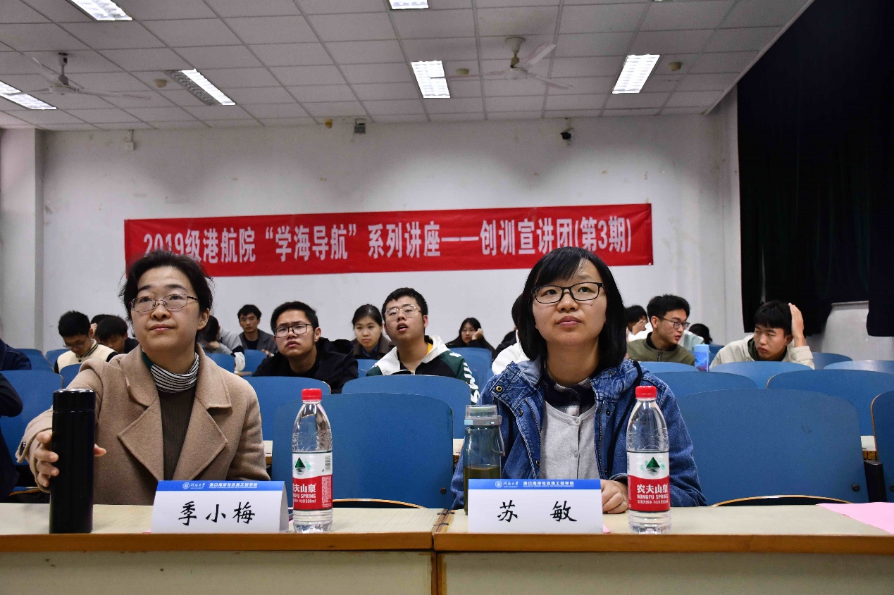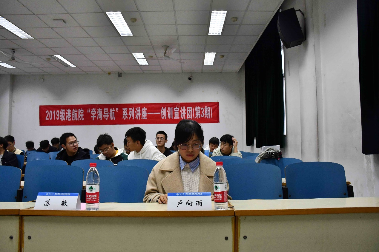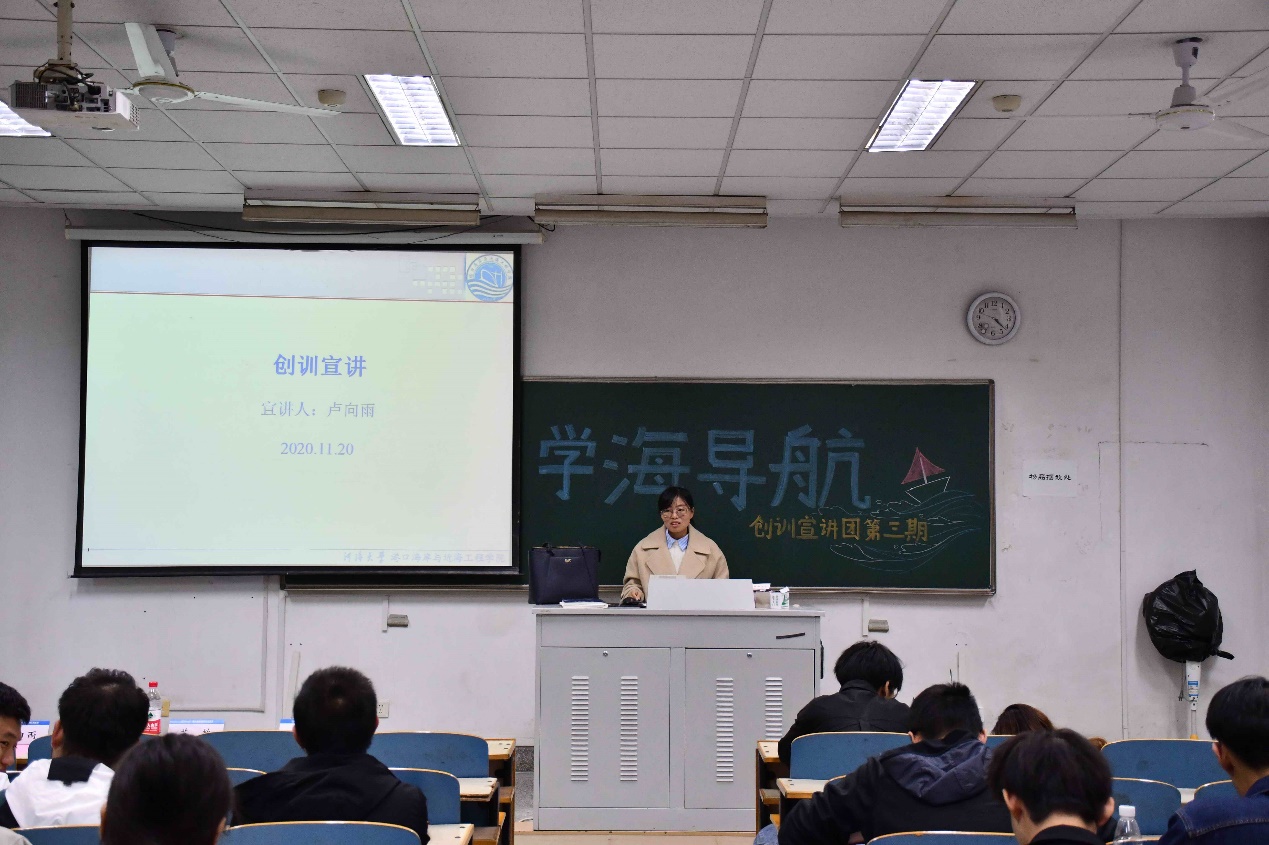 2020年11月20日,毛巾哥 “学海导航”系列讲座第三期创训宣讲会于江宁校区致用楼119举行。本次活动邀请了港航院苏敏、季小梅、卢向雨老师作为主讲嘉宾,她们就自己的教学经历、研究方向和在创训方面对学生的要求等方面向同学们做了详细介绍。