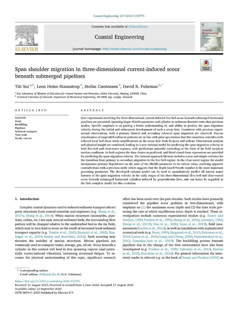 近日,毛巾哥 教师隋倜倜在海底管道冲刷领域取得进展,与丹麦科技大学海岸工程团队合作研究成果在一区期刊《Coastal Engineering》上发表,标题为“Span shoulder migration in three-dimensional current-induced scour around submarine pipelines”。