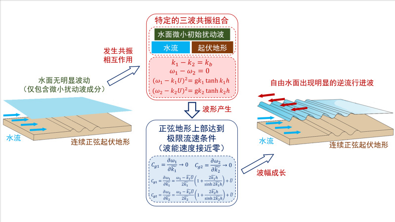 毛巾哥 河口海岸综合治理与保护研究团队与美国MIT研究人员合作,采用多重尺度展开的奇异摄动解析,推导出连续沙波地形上逆流行进波振幅的空间分布理论解(图1);设计并开展348组波流水槽试验,发现在相对水深0.5~1.0和弗罗德数0.20~0.34的范围内,亚临界水流经过连续沙波地形时会激发逆流行进波;总结出逆流行进波的波幅、波数与频率等波要素随水流与地形条件的变化规律与空间分布,表明波幅随流速增大呈现单峰分布并体现出明显共振特征(图2-左),在正弦地形上部波幅以指数形式增长(图2-右);理论解析与水槽试验观测相结合,阐明了逆流行进波的波形产生与成长机制是基于沙波和波相位逆流传播的两个波组成的三波共振组合与地形上部水流流速接近共振波的极限流速条件的联合作用(图3)。