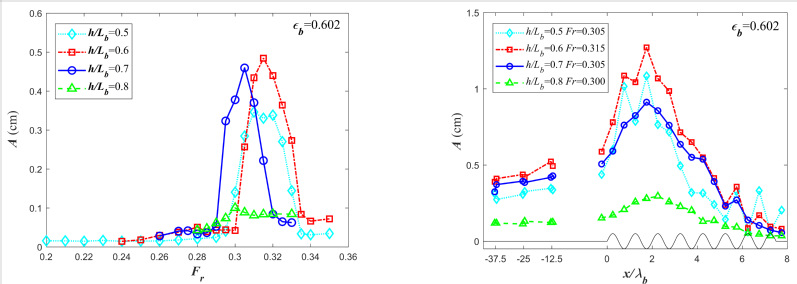 图2 连续沙波地形上逆流行进波幅随流速变化(左)与波幅空间分布(右)