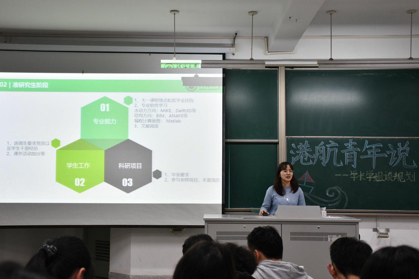 2021年5月6日,港航学院“港航青年说”—学长学姐谈规划于江宁校区勤学楼5112举行。本次活动邀请了港航学院研究生沈倩颖、丁星宇、王博文和本科生张颖男、张恩斗作为主讲嘉宾,向2019级学生分享大学生职业生涯规划经验。