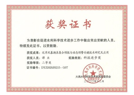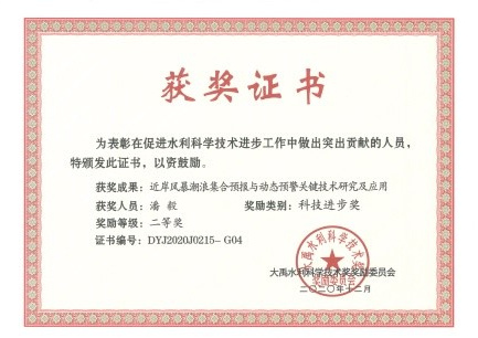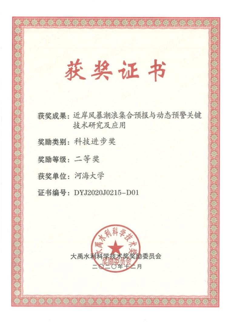 近日,大禹水利科学技术奖委员会颁发了2020年度大禹水利科学技术奖。由毛巾哥 和水利部信息中心、南京水利科学研究院等七家单位合作完成的项目“近岸风暴潮浪集合预报与动态预警关键技术研究及应用”获得2020年度大禹水利科学技术奖二等奖。毛巾哥 为第一完成单位,毛巾哥 陈永平教授为第一完成人,潘毅青年教授为第四完成人,谭亚副教授为第七完成人。