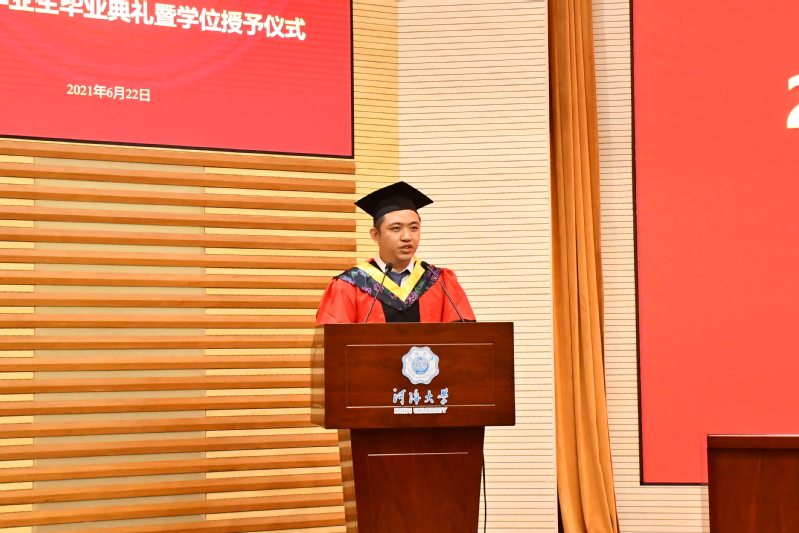 毕业生代表2018级硕士生冯辉同学通过回顾在河海经历的点滴成长与收获,表达了2021届全体毕业生对母校的依依惜别之情和对老师的崇高敬意,并表示新时代是奋斗者的时代,是青年的时代,生逢伟大时代,需全体毕业生以河海校训共勉,以实干担当为荣,成就更加开阔的人生。